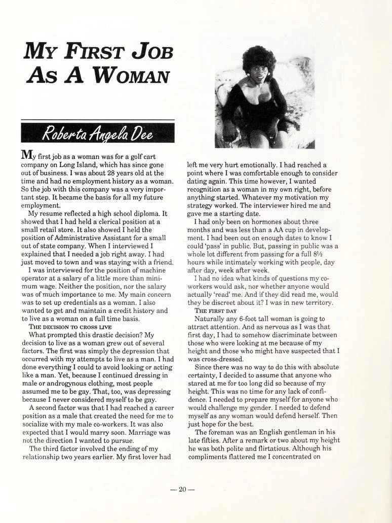 “My First Job as a Woman” by Roberta Angela Dee, 1991 ARTICLES and INTERVIEWS Nov 3 Written By Kyky Archives View fullsize View fullsize View fullsize Article on Roberta Angela Dee in En Femme Magazine, Vol. 16, April 1991Source: Digital Trans Archive on Archive.org En Femme Magazine1991transgendertrans women1990's Kyky Archives